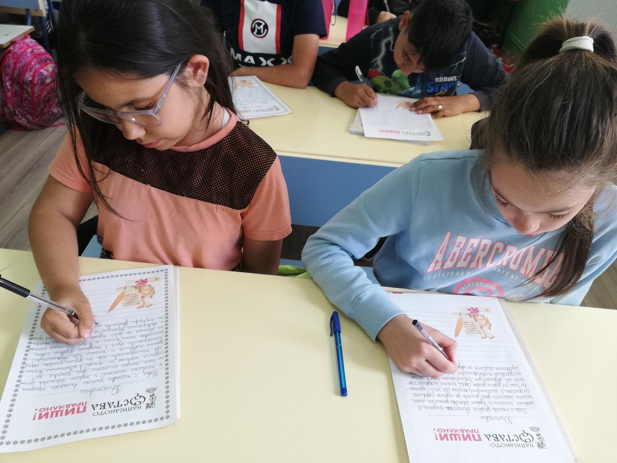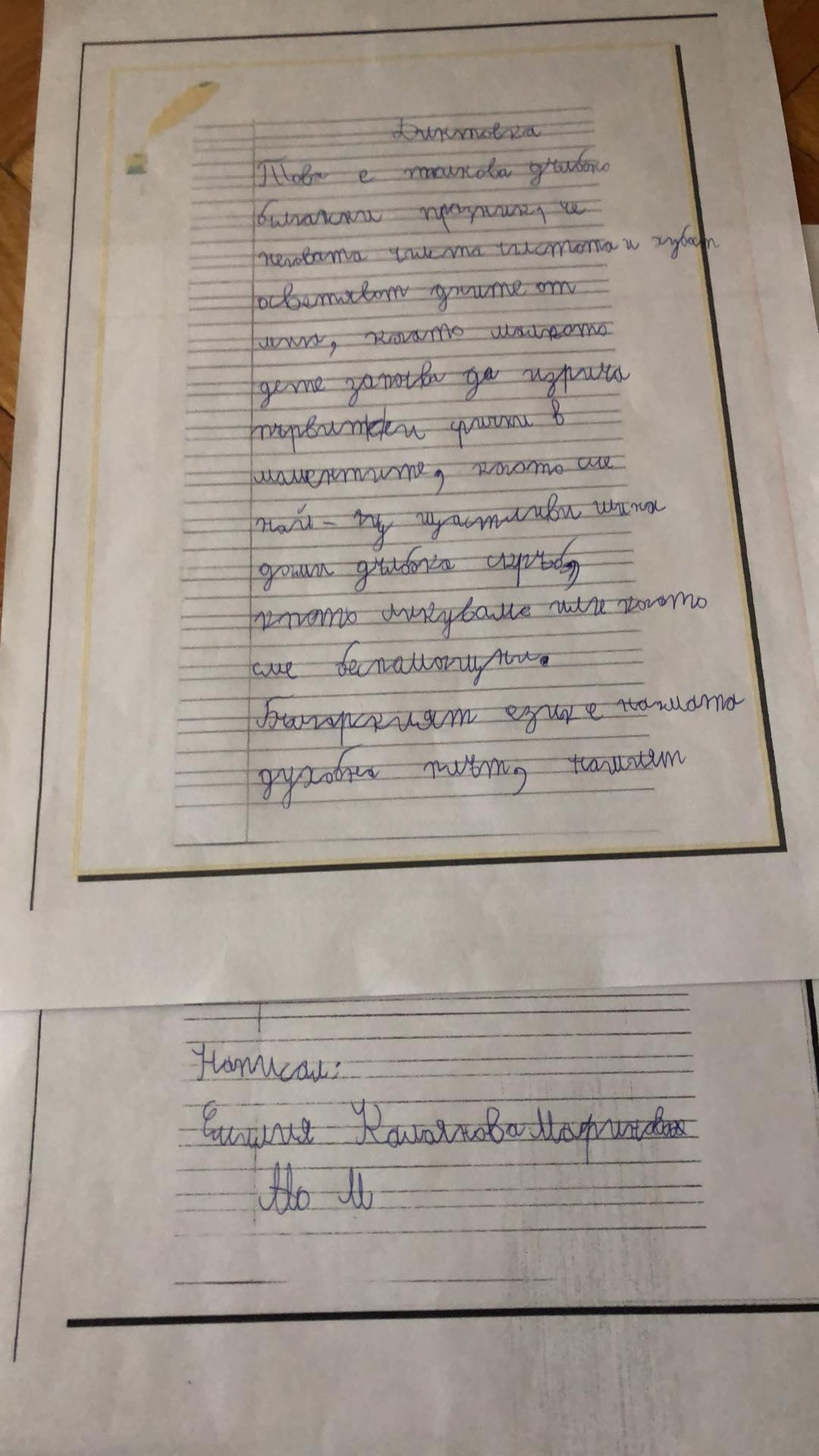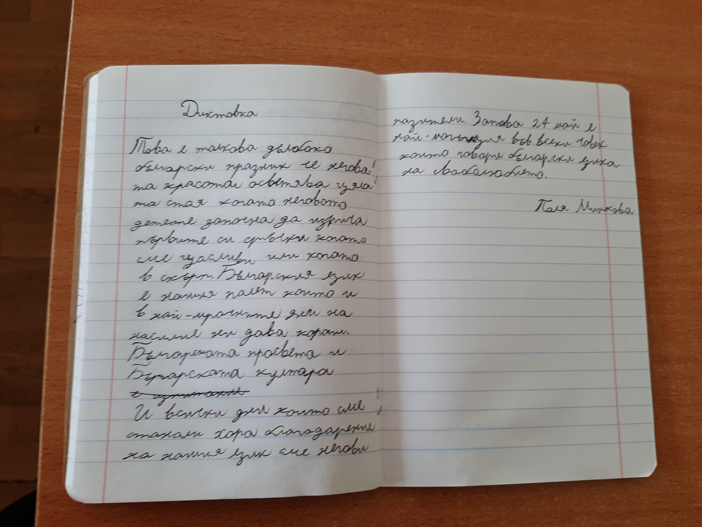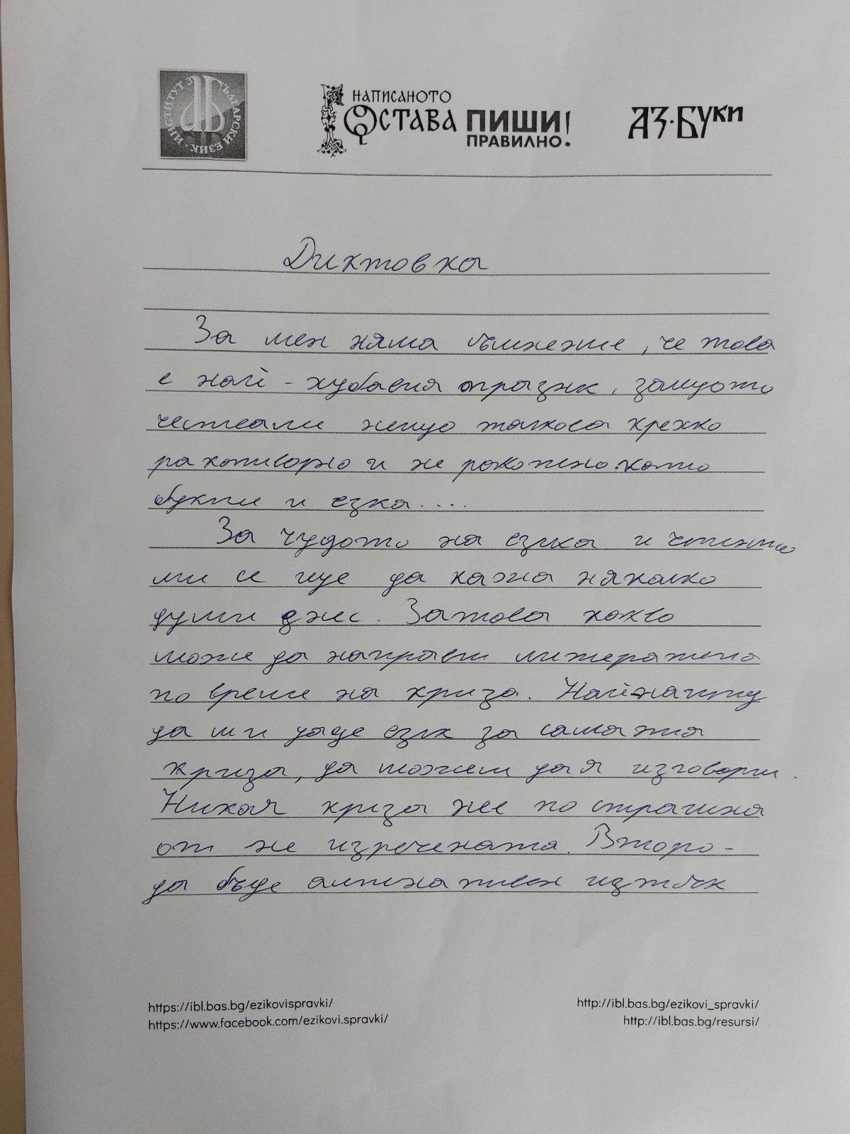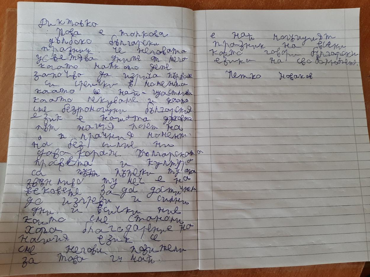 „ Всеки българин трябва да се гордее с това, че пишe на своя език, със своя писменост, свои букви. Макар че още от първи клас бяха затворени по домовете си, това не попречи на учениците да се научат да пишат и четат на своя език. Всички ученици от класа направиха диктовката, въпреки че по-голямата част са билингви и допускат грешки. Представяме пред Вас най-добре написаните.“ Радослава Кичукова