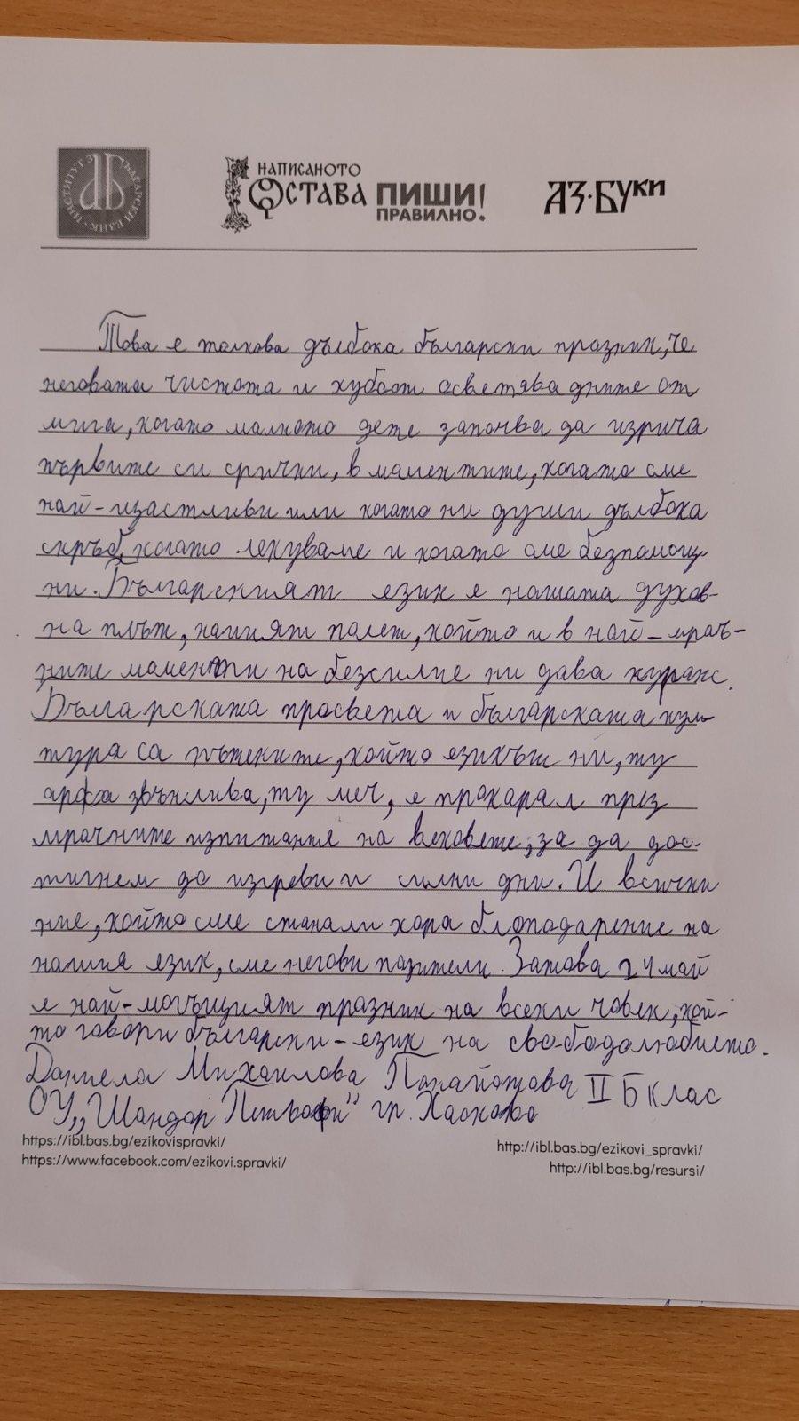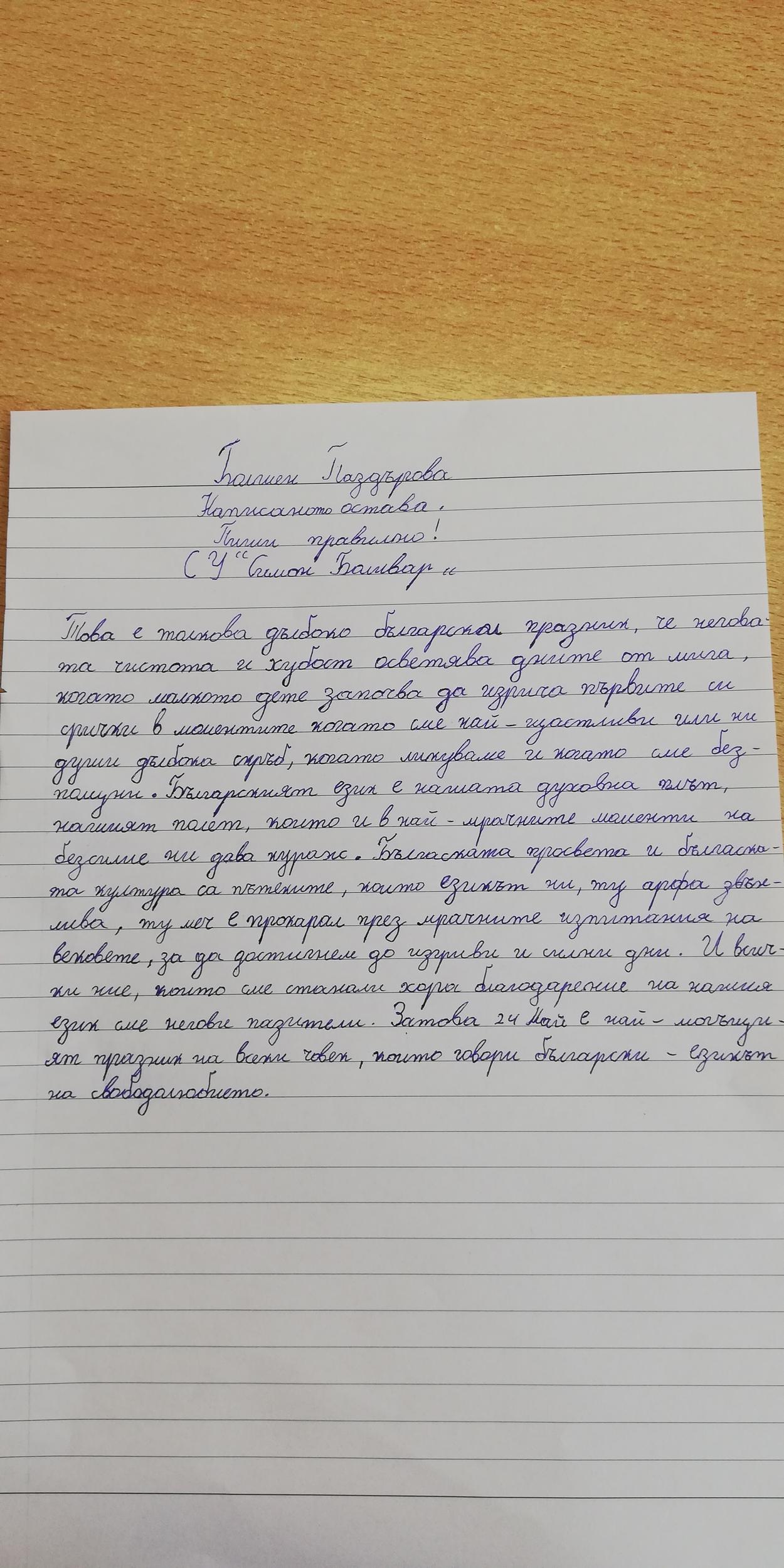 „Учениците от 4. Б група от училище СУ „Св. Климент Охридски“ – гр. Аксаково, с желание приеха да участват в тази кампания по повод 24 май. Споделиха колко е важно да си грамотен, старателен и да пишеш красиво. Учениците показаха най-доброто, на което са способни.“ Диана Ялъмова