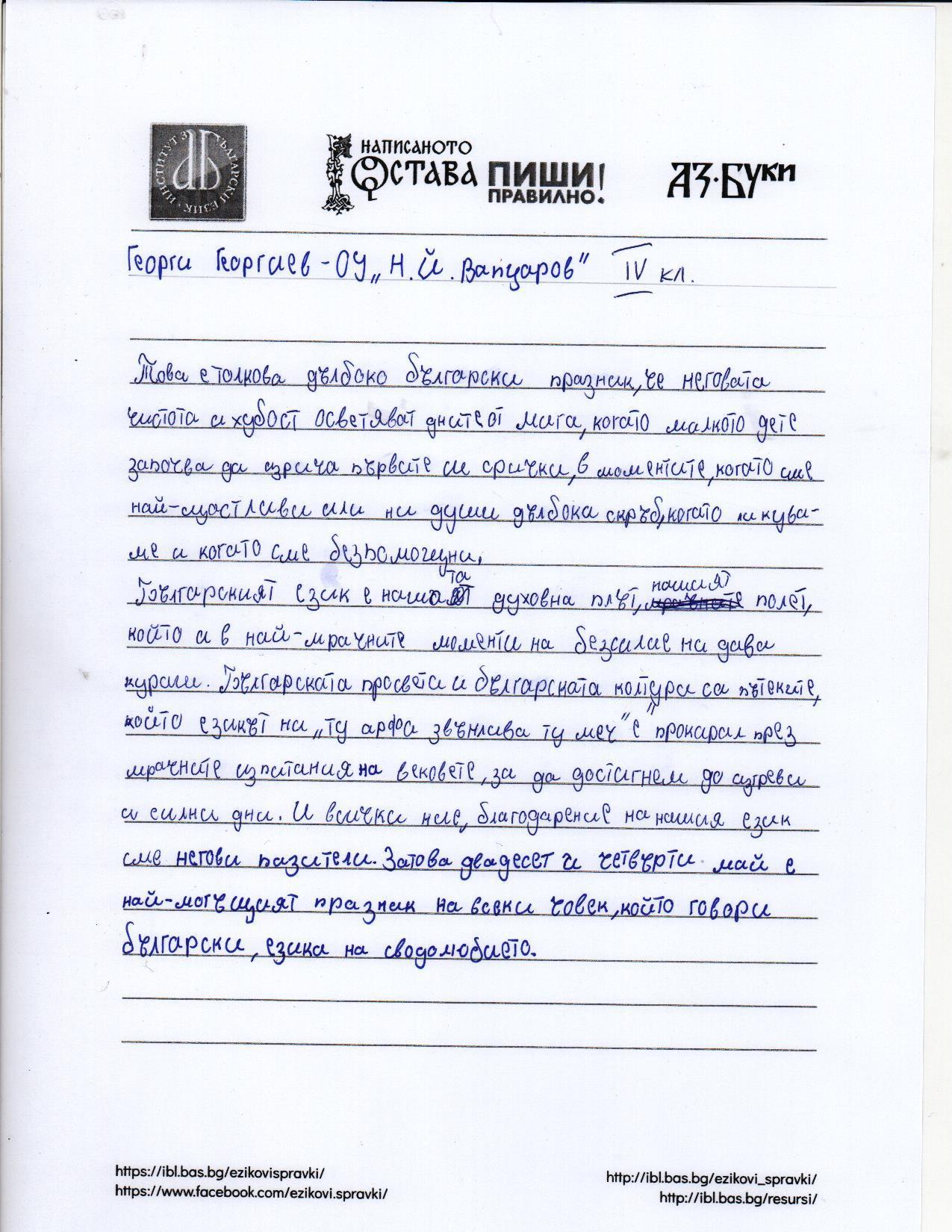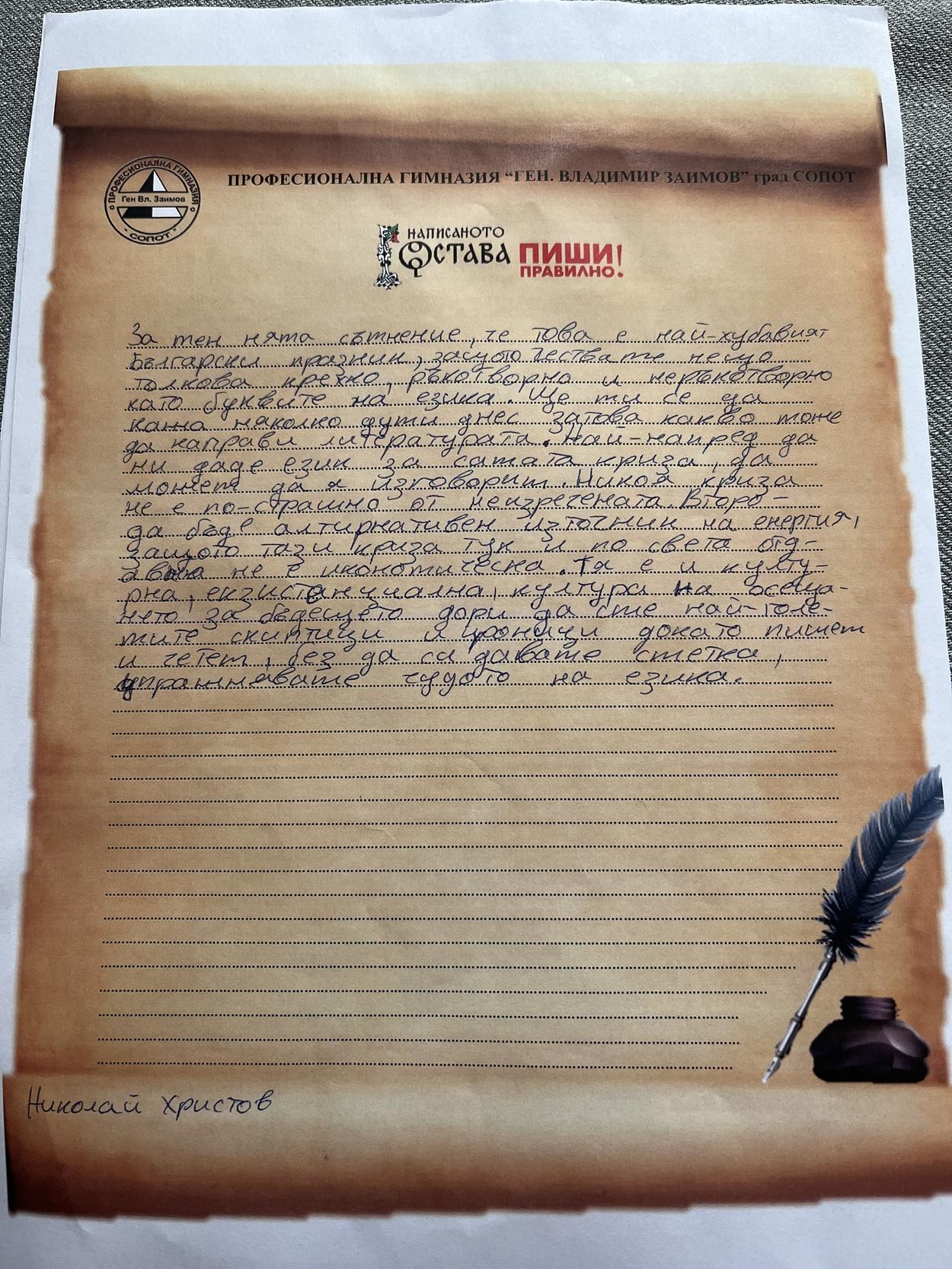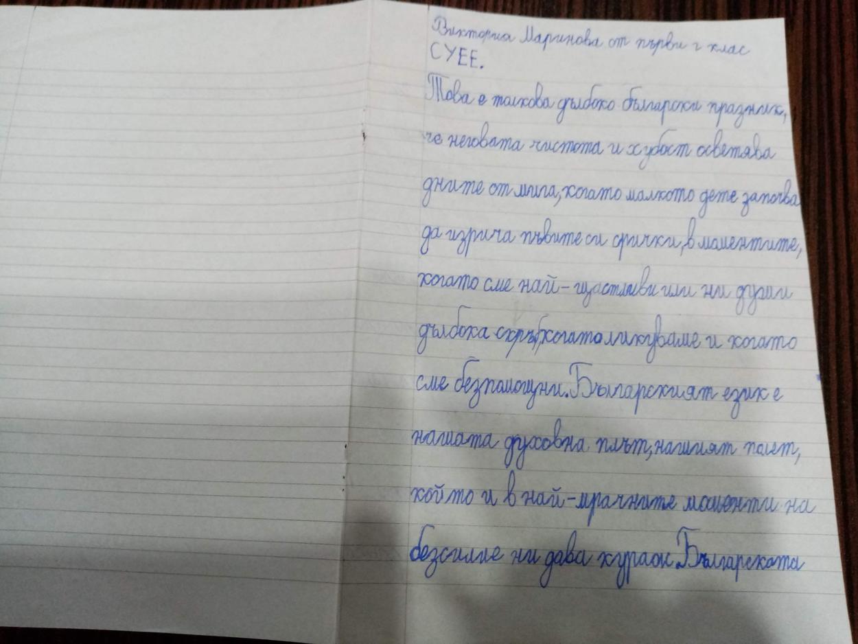 „Нашият клас участва за втори път в инициативата Ви. Всички писаха с ентусиазъм и според индивидуалните си възможности за краснопис и правопис. Най-добрите, с усмивка, заслужиха и снимка.“ Иванина Пеева