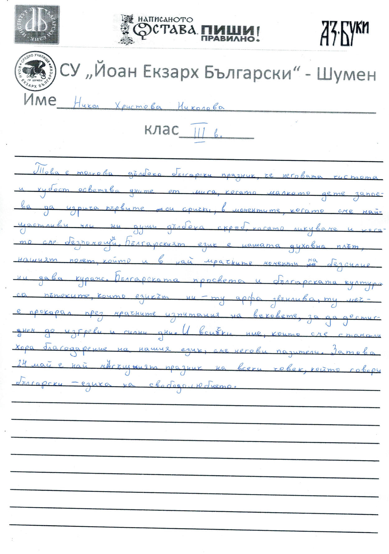 „БПГ „Ичко Бойчев“, гр. Благоевград, участва за първи път в конкурса по случай 24 май – Деня на светите братя Кирил и Методий, на българската азбука, просвета и култура и на славянската книжовност, организиран от Института за български език „Професор Любомир Андрейчин“ при БАН. Участие взеха голям брой ученици, но изпращаме само диктовките на най-добрите от тях.“ Яница Костадинова Маврикова