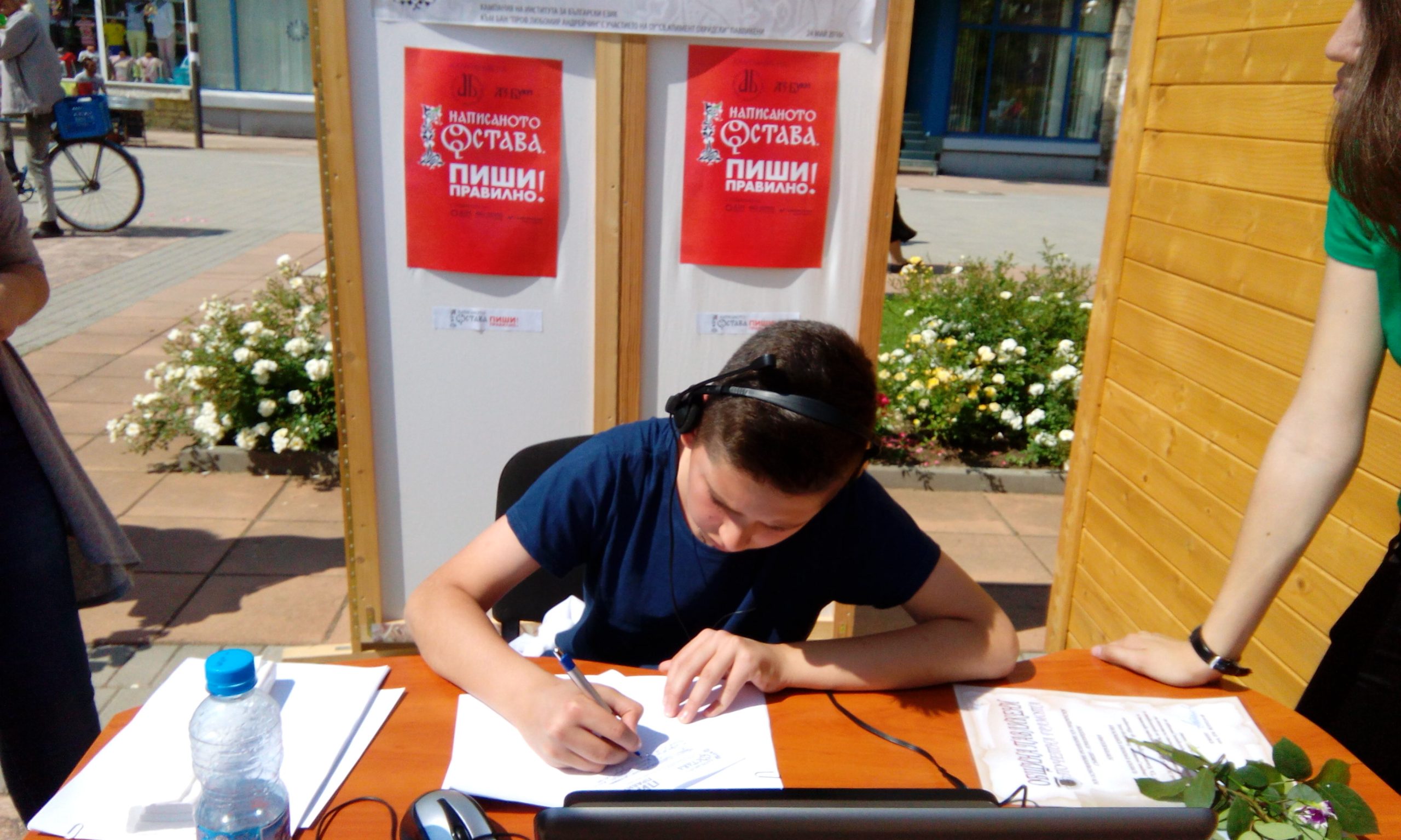 В Сливен кампанията „Написаното остава. Пиши правилно!“ се проведе с инициативата на ученици от 10 клас от 11-то СОУ „Константин Константинов“ и техни учители. С любезното съдействие на общината бяха осигурени лаптопи и слушалки, а в проверката на грамотността на градския площад се включиха и деца, и възрастни.
