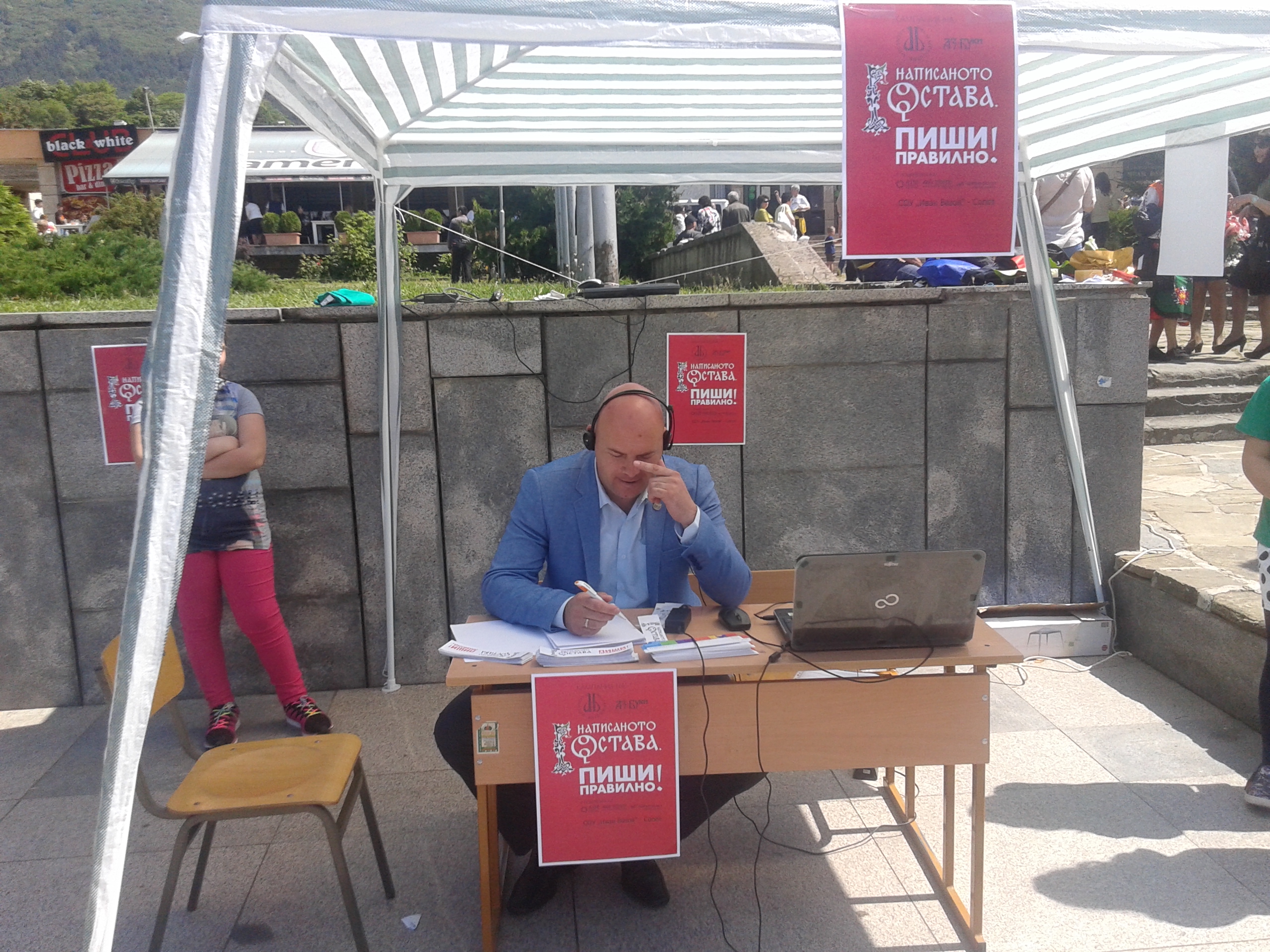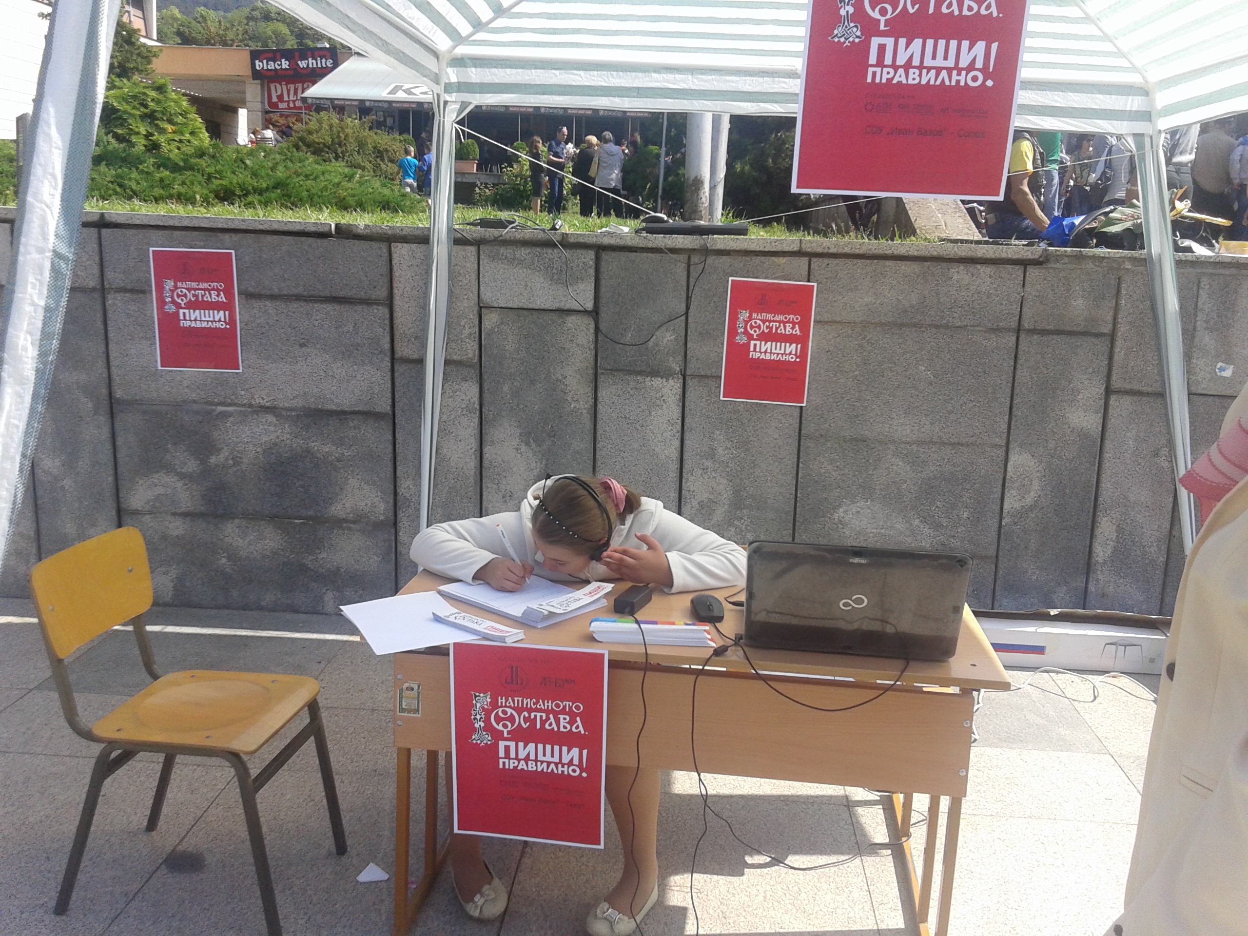На два обособени пункта – на изхода на метростанция „Сердика“ на площад „Света Неделя“ и до Паметника на Радой Ралин – всеки желаещ получи възможност да провери познанията си по правопис и пунктуация. Подготвени бяха две кратки диктовки по откъси от тематично подбрани текстове – „Българският език и богатството на българското слово“ от Александър Балабанов и „Чудото на четенето“ от Георги Господинов. На изхода на метрото срещу Софийския университет учените от БАН поздравяваха минувачите по случай празника и разговаряха с тях за често срещани правописни и пунктуационни грешки, които бяха онагледени с текст за редакция. Всеки можеше да провери знанията си самостоятелно и да ги свери с обясненията на допуснатите в текста грешки, подготвени от езиковедите. Всички участници бяха насърчени да пазят чистия и правилен български език и получиха стикери с надпис „Написаното остава. Пиши правилно!“. Целта на стикерите е да се насочи вниманието към неправилните надписи, които срещаме всекидневно. Представилите се най-добре ще продължат да разпространяват идеята, че „Написаното остава“, и чрез тениските, които получиха.