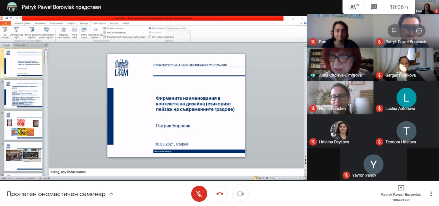 Семинарът беше посветен на ономастични въпроси. В своята лекция д-р Патрик Боровяк от Института по славянска филология към Университета „Адам Мицкевич“, Познан, Полша, който в момента е гост на Секцията по ономастика на Института за български език, представи последните си изследвания на тема: „Фирмените наименования в контекста на дизайна (езиковият пейзаж на съвременните градове)“. Лекцията се състоя онлайн.
